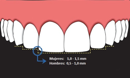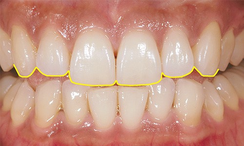 En la siguiente imagen podemos comprobar cómo, en la que sería una sonrisa perfectamente nivelada, los dientes anteriores tienen los bordes incisales:
